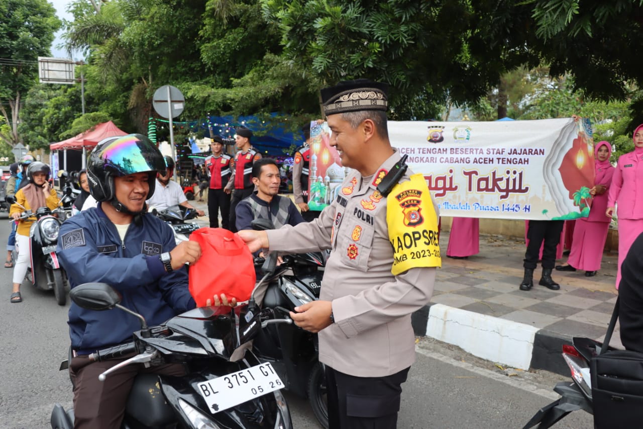 Takengon– Kapolres Aceh Tengah AKBP Dody Indra Eka Putra, didampingi Ketua Bhayangkari cabang Ny.Dian Dody beserta pengurus Bhayangkari dan PJU membagikan takjil kepada pengendara dan masyarakat yang melintas Simpang depan Mapolres, Rabu 03 April 2024.