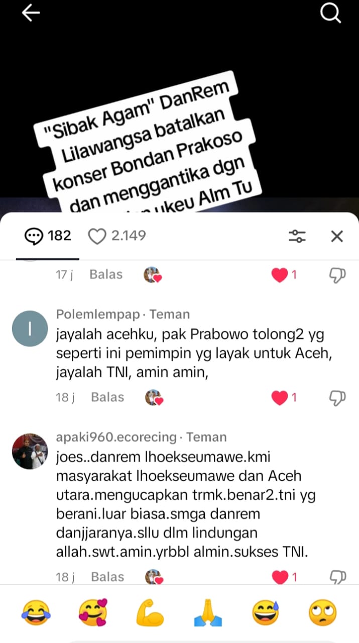 Kabar duka itupun disahut positif oleh Komandan Korem (Danrem) 011/Lilawangsa Kolonel Inf Ali Imran yang membatalkan konser Artis Ibu Kota Bondan Prakoso.