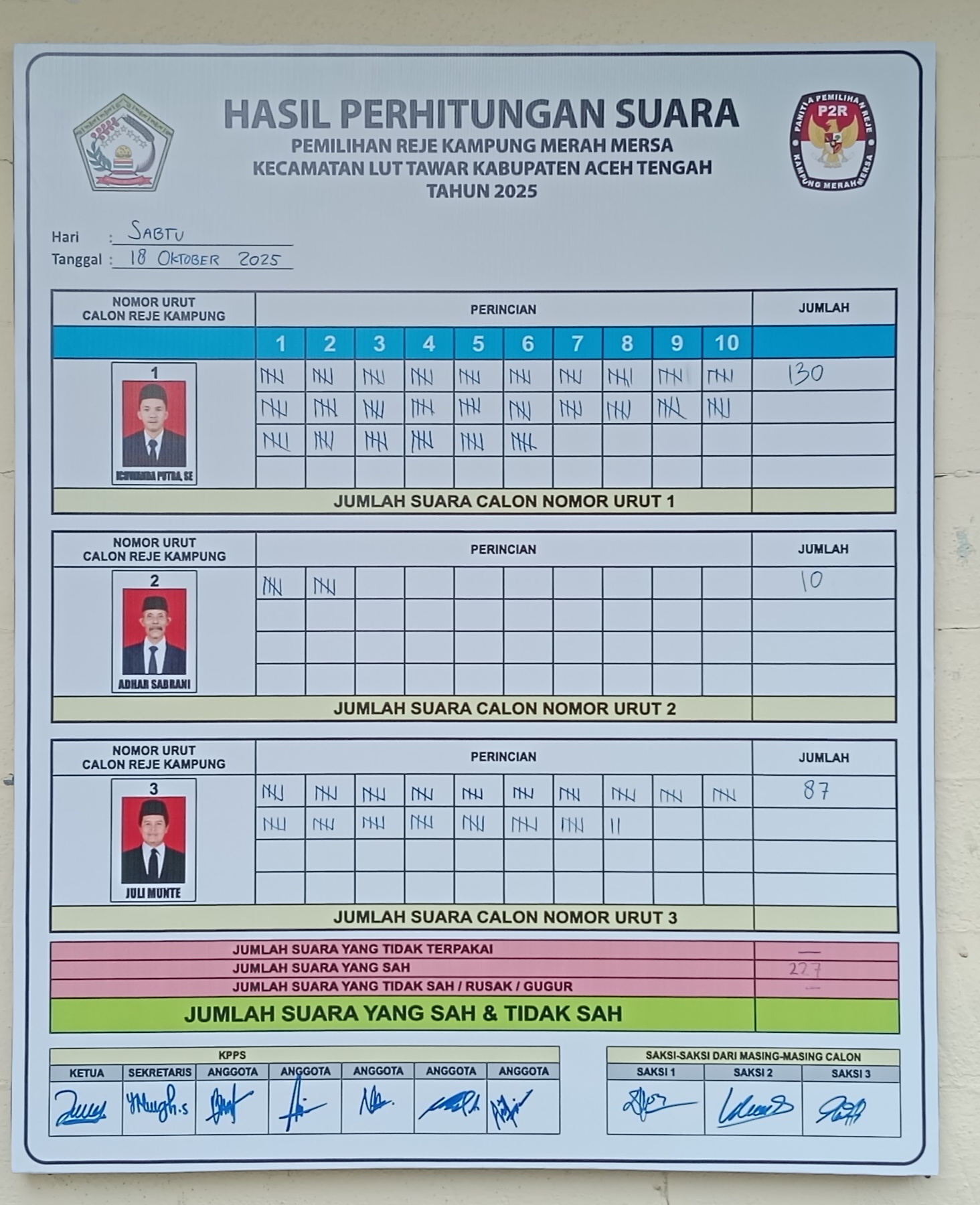 Dengan hasil tersebut, Ichwanda Putra resmi terpilih sebagai Reje Kampung Merah Mersa untuk periode 2025–2031, setelah memperoleh suara mayoritas dari warga.