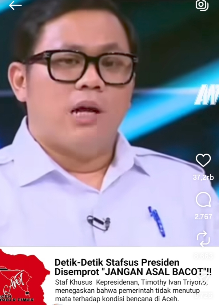 Potongan wawancara itu disiarkan ulang di IG Acehworldtimes, seperti KenNews lihat pada Kamis, 18 Desember 2025 dengan judul Detik-detik stafsus presiden disemprot “Jangan Asal Bacot”