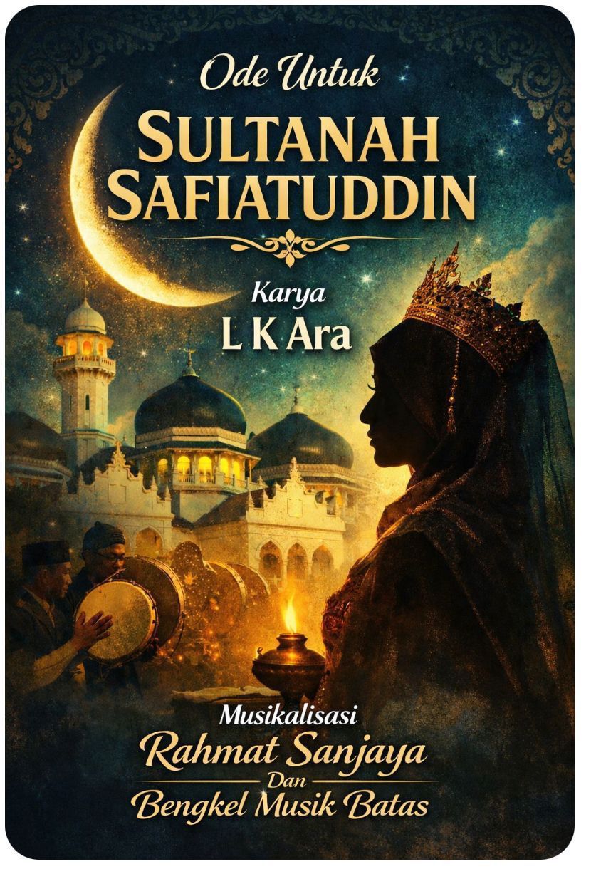 “Ode Untuk Sultanah Safiatuddin” merupakan puisi dramatik karya L K Ara yang mengangkat sosok Sultanah Safiatuddin sebagai simbol kepemimpinan perempuan, spiritualitas, dan kebesaran sejarah Aceh. Melalui musikalisasi ini, puisi tersebut akan dipentaskan dengan iringan perkusi, lantunan vokal, serta atmosfer panggung yang menggambarkan kejayaan masa Kesultanan Aceh.