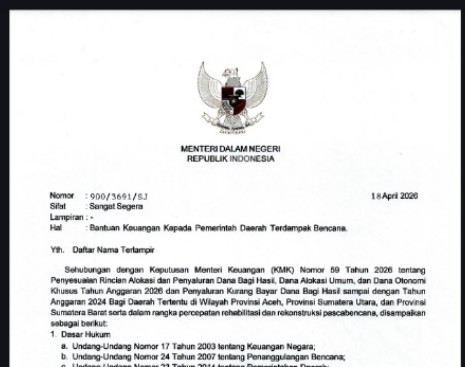 Bantuan tersebut merujuk pada surat Menteri Dalam Negeri nomor 900/3691/SJ tentang Bantuan Keuangan Kepada Pemerintah Daerah Terdampak Bencana Tertanggal 18 April 2026 yang ditandatangani oleh Mendagri Muhammad Tito Karnavian